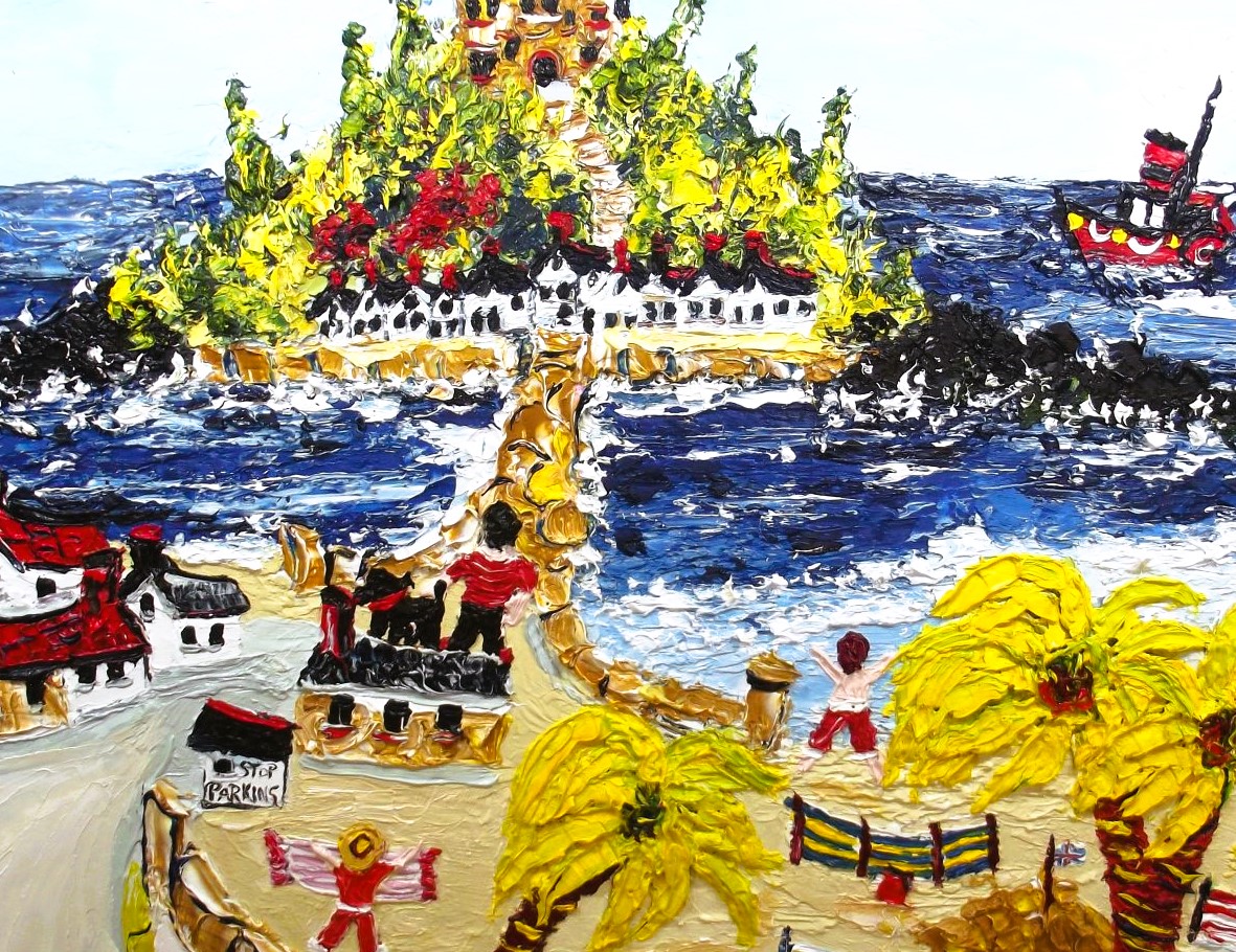 Description: THIS THICK OIL,S PAINTING IS ON MY EXTRA-EXTRA LARGE DEEP EDGE CANVASE all in my own naive style of the mount in marazion cornwall in my own style of extra thick oil,s with load,s of textures and very strong colour,s -very vibrant its on a deep edged canvase ,so its ready to hang no framing is needed, it will brighten up any room in your house,==please note you can exchange any painting up to one month after buying, this offer hase always been on my site ,but not one person hase done so in 20 years, in fact a lot of collecters of my work have perchased more , up to 20 in some case,s but the offer is there for one and all many thanks to all my custmer,s jim rodgers
