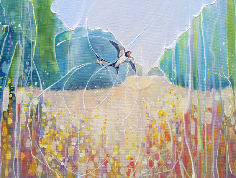 Keywords: Swallows, summer, trees, meadows, flowers, wildflowers, energetic, euphoric, art nouveau, birds, joyful, happy, fields, magical landscape painting, colourful abstract landscape, stunning landscapes, realism vs abstract, Sussex landscape paintings, magical paintings, ethereal paintings, mystical, spiritual paintings, vibrantly coloured landscape paintings, bright vivid colours, Gill Bustamante paintings, Sussex artist, nature, wildlife paintings, gillbustamante.com, large oil paintings, British artists, independent artist, contemporary semi-abstract landscape paintings, oil paintings for sale, big landscape paintings for sale,