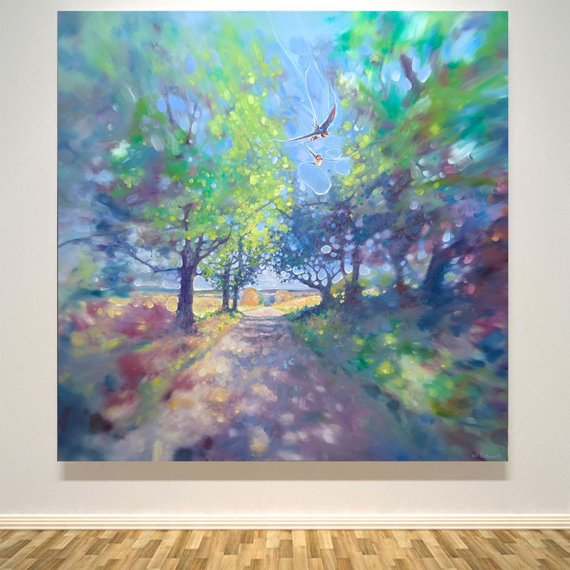 Farewell Swallows is a large original oil painting of two swallows in a semi-abstract English countryside landscape. It is 36x36x1.5 inches. The painting shows a tree lined country lane with a hint of the landscape in the far distance that the road is travelling to. The sun is filtering through the trees from the left casting dappled shadows on the track. Two swallows have burst through the trees moving impossibly fast as swallows do. The painting is an actual place in East Sussex. I took a walk there in September where I watched the swallows fattening up on insects in midair just prior to their long trip south. The lane goes down to the Ouse river valley and gentle hills around Lewes. To the right, if you were standing in this exact spot, you would see Seaford Head on the English south coast and Lewes castle off to the left. I painted the scene deliberately recognizable and yet a little odd as this better reflects the beautiful timelessness and otherworldliness of some of the areas I walk in. Painted on deep edge canvas, edges white, ready to hang and comes with certificate of authenticity.