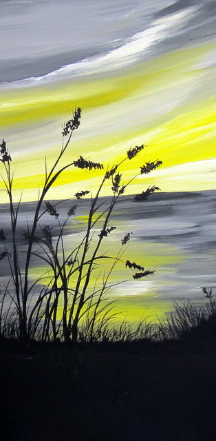 This acrylic painting will look great in a traditional home or a more contemporary one.A bright cheerful sunset is reflected in the sea-and the grasses are in silhouette
