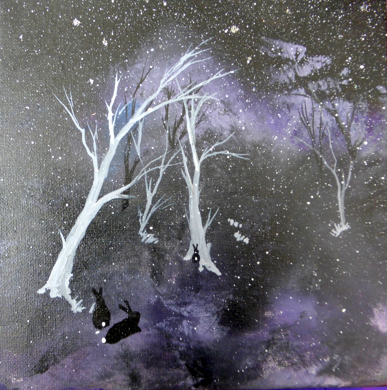 Painted in acrylic using some lovely shades of blues , snow is gently starting to fall and the hares are under the tree watching it!