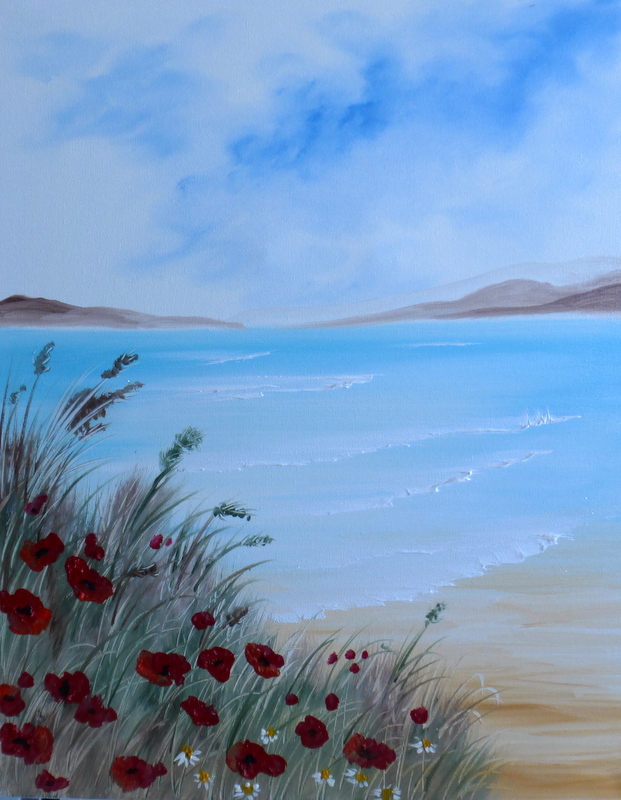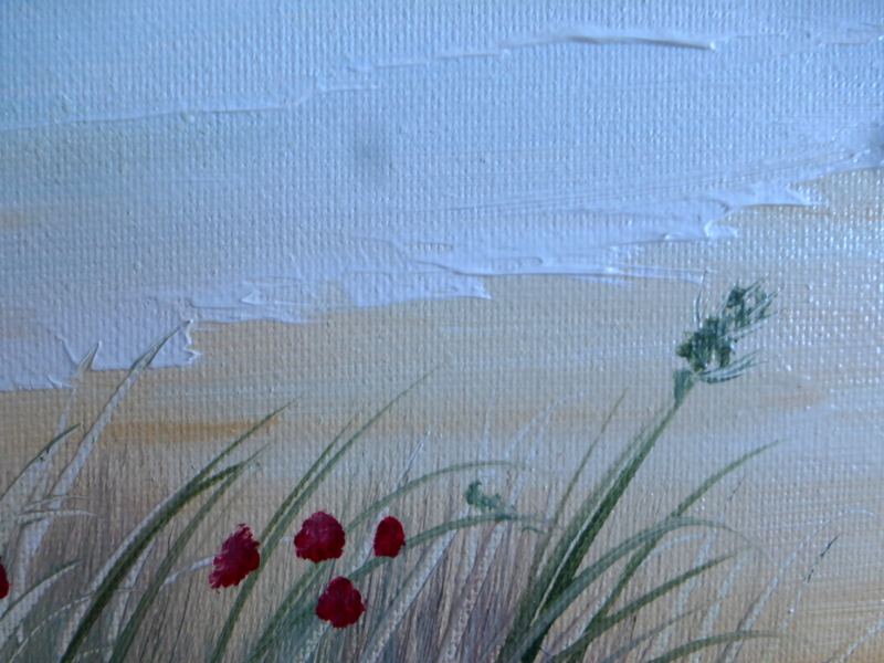 Keywords: Beach,seascape,summer,poppies,original oils,Diane Jennings,canvas,blue, red,waves,