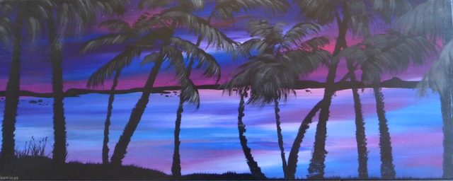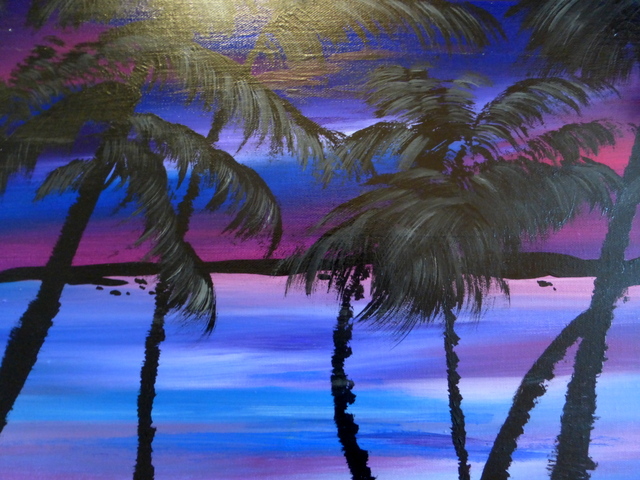 Keywords: Original acrylic painting,Diane Jennings,palm trees,sunset,purple,blue,black