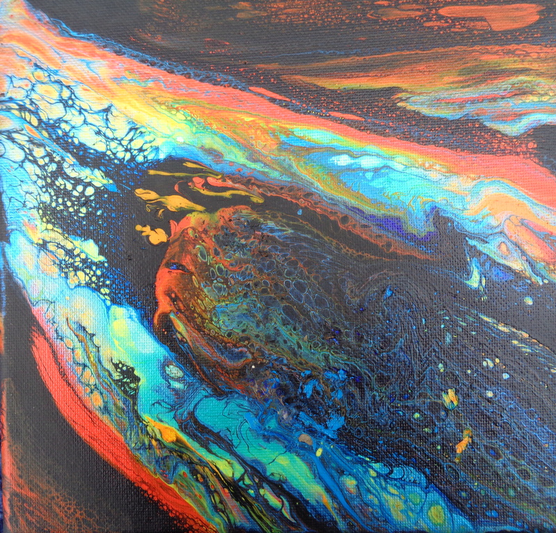 Keywords: Blazing,comet,original acrylic painting,Diane Jennings,metalic blue,black,orange,red,lime,texture