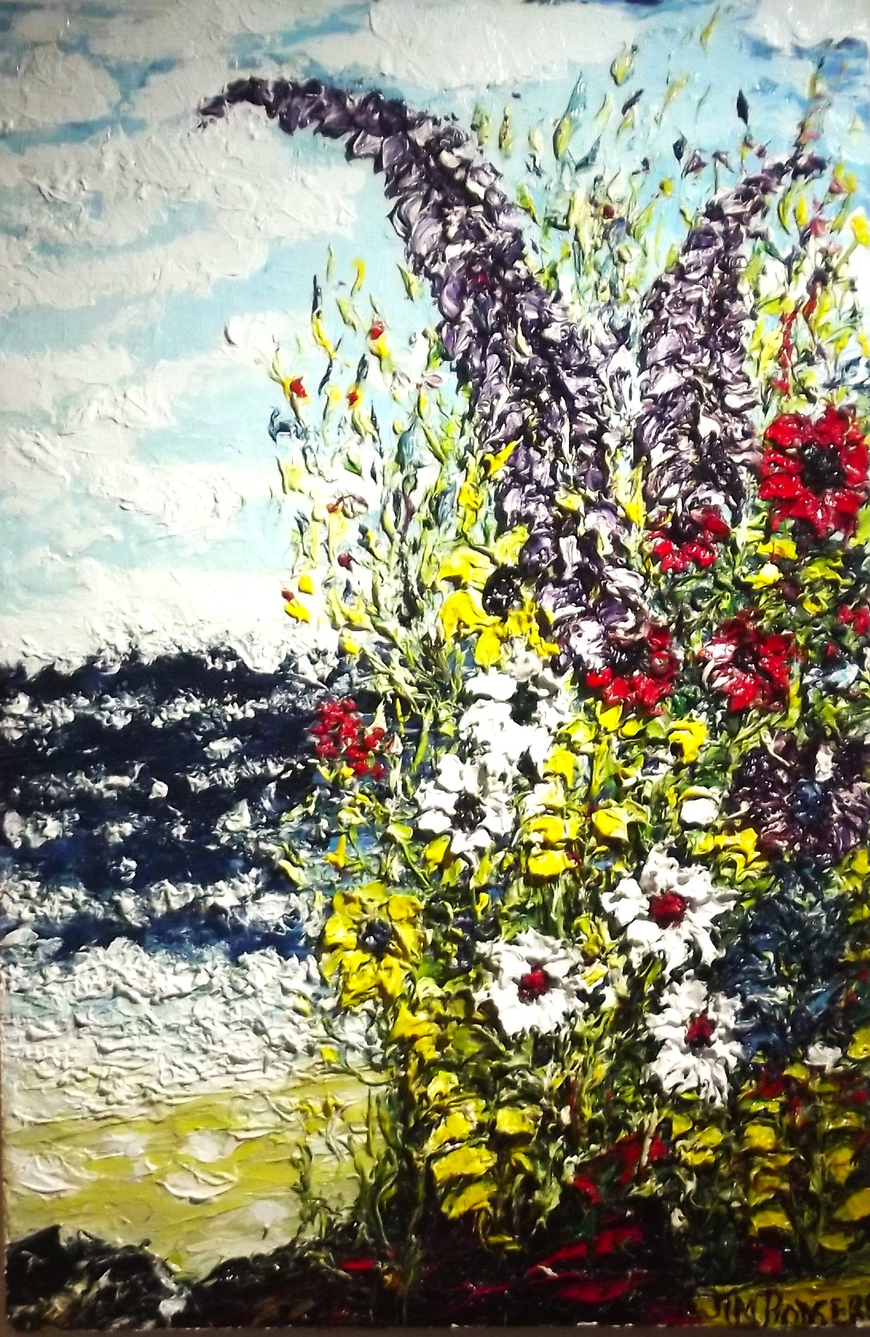 Title: WILD HOLLY HOCKS BY THE BEACH