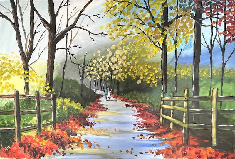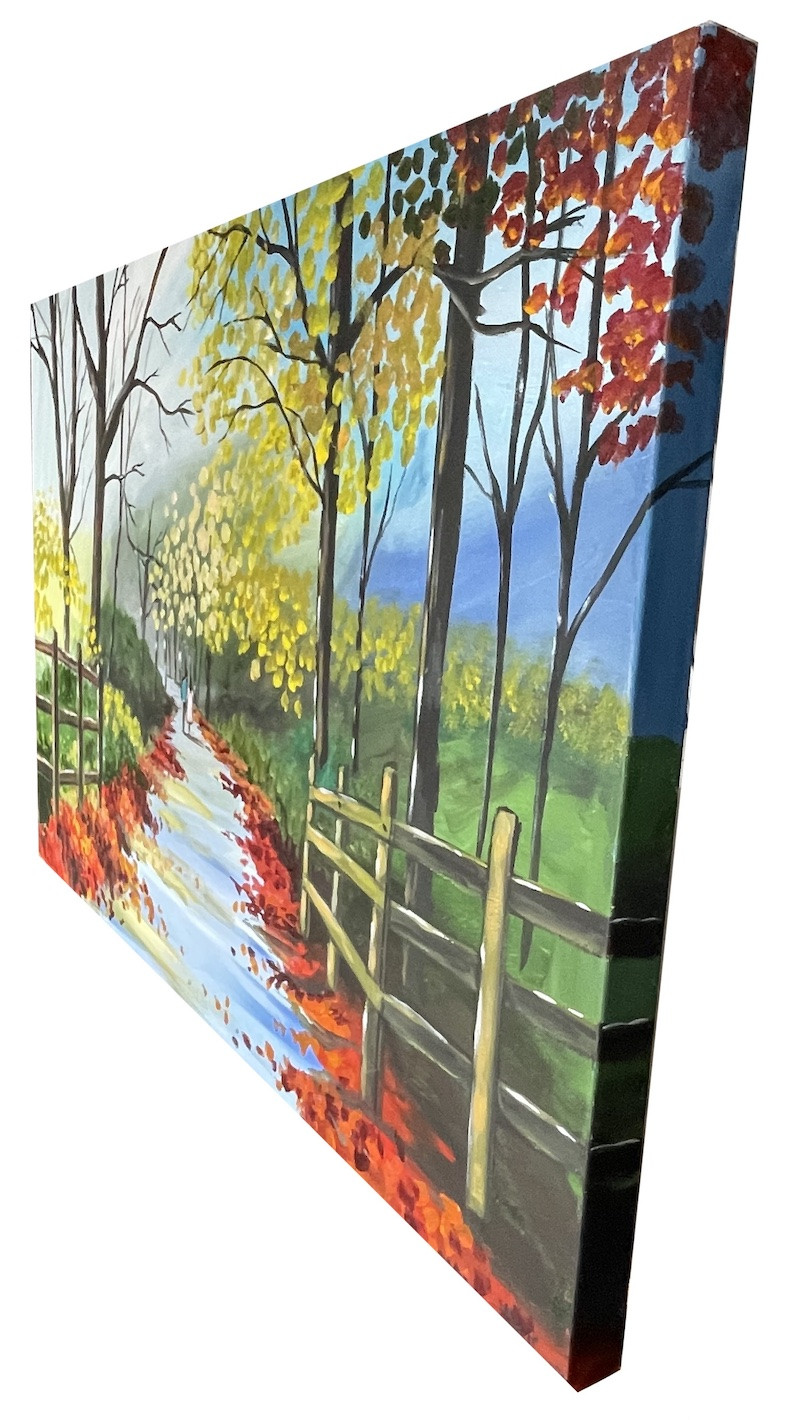 Description: A beautiful and colourful painting depicting the beauty of autumn as a couple enjoy a blissful walk through the colourful trees and the crispy leaves lining the path ahead. This painting continues over the sides so it may be hung without a frame. The painting has been varnished with gloss for protection and signed by the artist. The canvas has been wired at the back so it may be instantly hung onto the wall. The painting will be carefully packed into a custom made box and delivered within 2 working days by a tracked courier service. Also comes with a certificate of authenticity.
