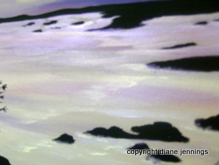 I have used shades of purple, mauve, pinks and creams with the rocks and grass in black-silhouetted against the sky and water.