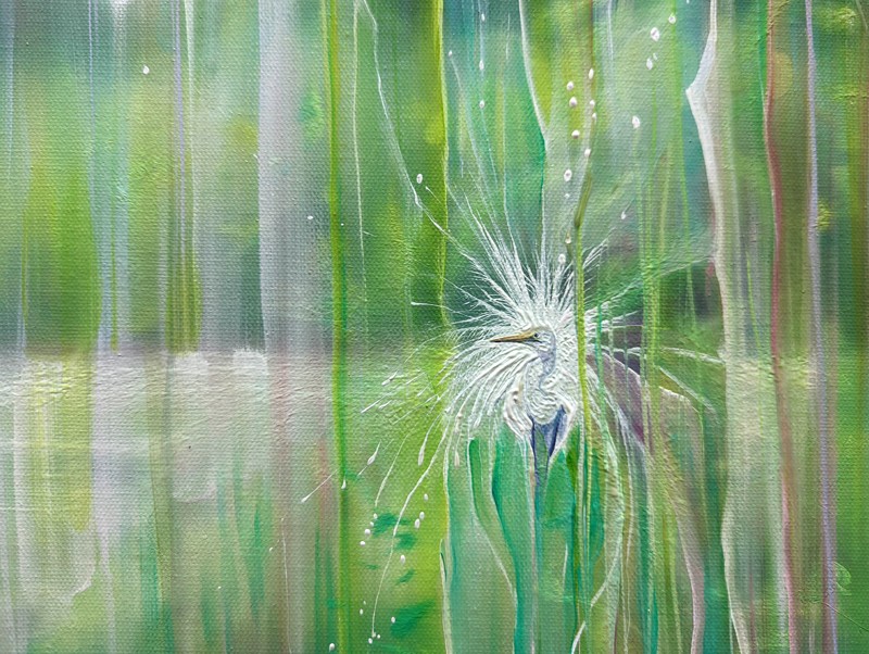 Title: Emanation is a semi-abstract contemporary landscape with white egret o