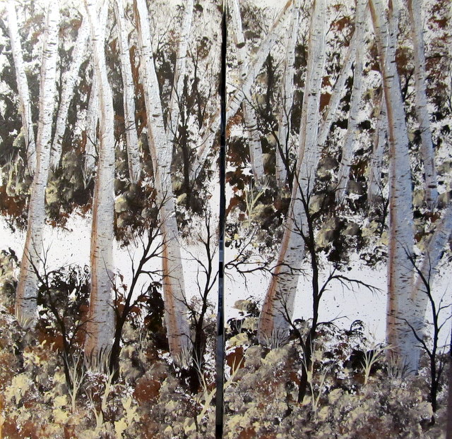 The birch trees have been painted using a silver paint with brown highlights...the light catches the silver beautifuly and the trees seem to stand out from the canvas.