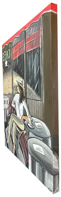 A woman sits inside a cafe waiting for her friend. A chance to meet up and catch up in all that has passed. Lights and shadows play around in this vibrant impressionistic painting that is a delight to view. The painting continues over the sides so it may be hung without a frame. The canvas has been wired at the back for hanging straight onto the wall. The painting has been varnished with gloss for protection and signed by the artist in the corner. The painting will be carefully packed into a custom made box and delivered within 2 working days by a tracked courier service. Also comes with a certificate of authenticity.