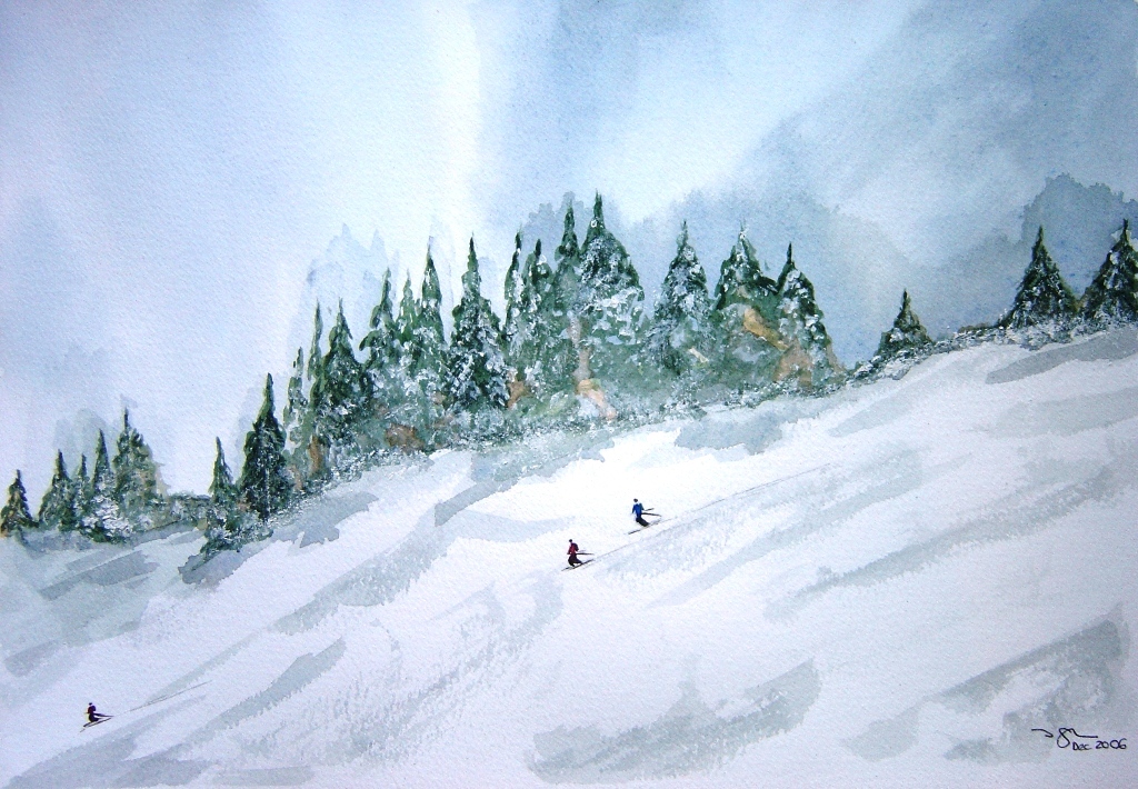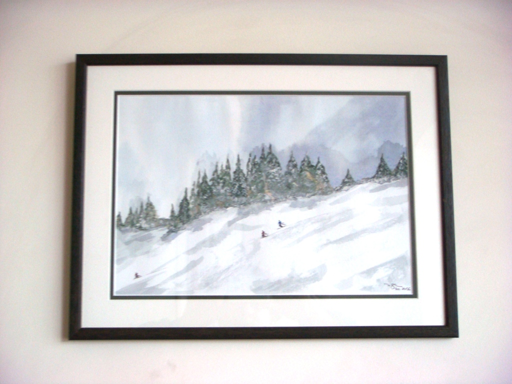 Description: Watercolour which is surrounded by a 5mm forest green mount in a simple dark rosewood frame. Dimensions of frame 42 x 32 cm. Picture is of a snowy downhill ski run in Breckenridge Colorado featuring 3 skiers. Ready to hang.
