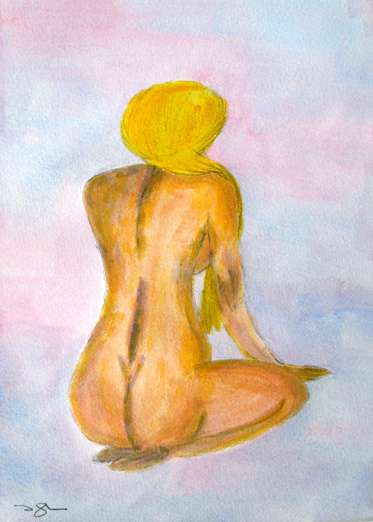 Keywords: Nude, female, golden, figurative, watercolour, hair, silence, love