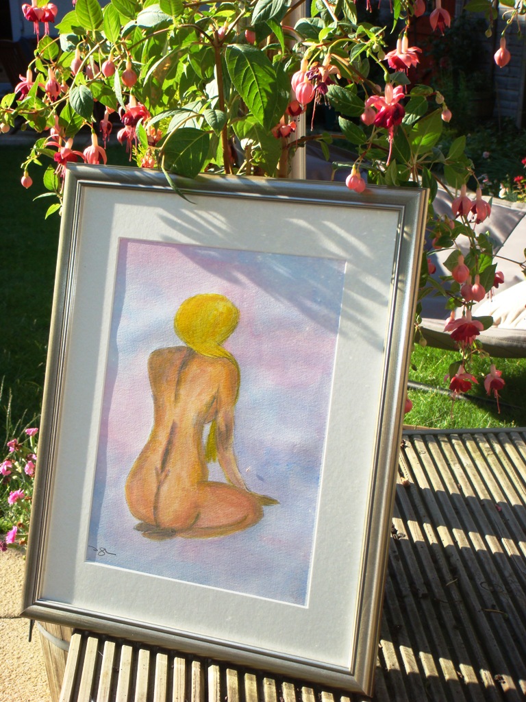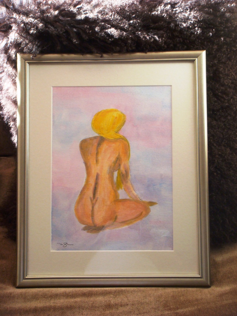 An original acrylic watercolour of a naked lady kneeling painted from behind; silent and contemplating. Her long golden hair tumbling over her right shoulder. Signed by the artist: D Shawcross. Framed and ready to hang. Frame:25mm wide cushion shaped silver coloured picture frame moulding. Made from real pine wood with a distressed/leaf finish and acrylic safety glazing. Single ivory mount 55mm diameter.