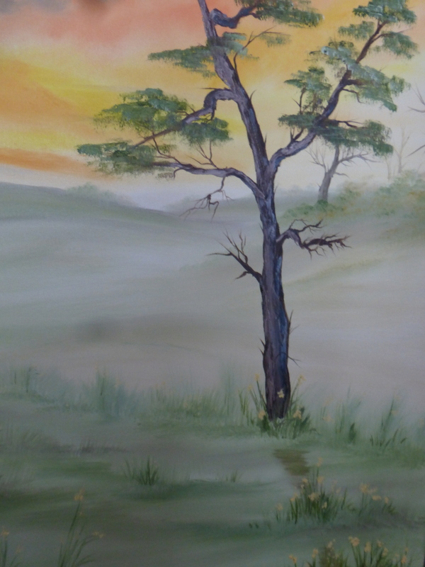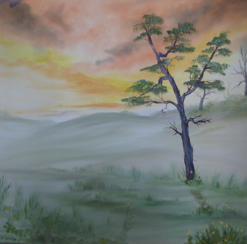 Keywords: Dawn,sky,original,canvas,Diane Jennings,yellow,orange,hills,tree,oils,