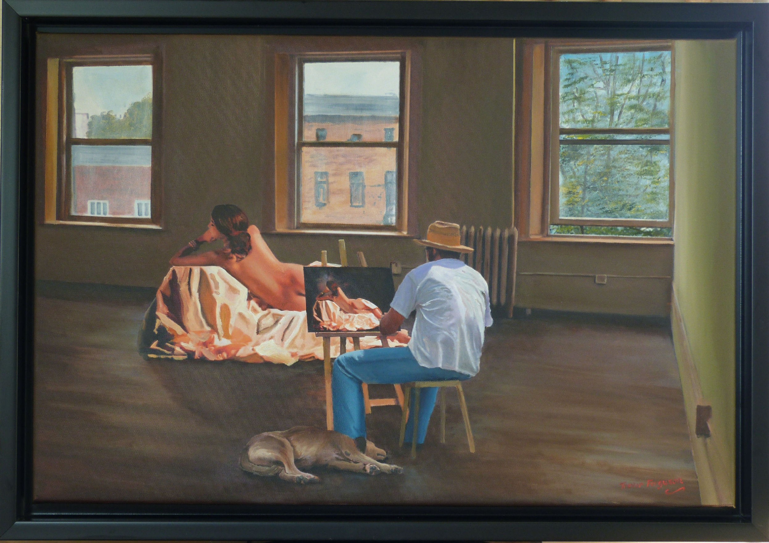 An artist at work on a classic nude study in the studio. Painted on a standard stretched canvas it is set in a contemporary dark tray frame measuring 68 cm x 48 cm x 35 mm overall. This work is also available as part of a pair of paintings with a narrative - this and his finished work. The pair are available for a reduced price when buying the two.