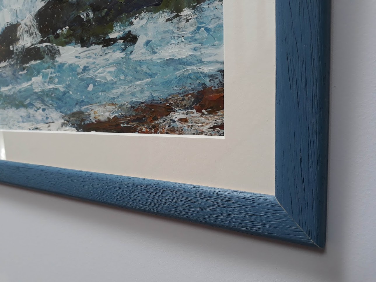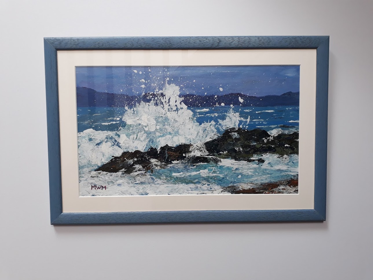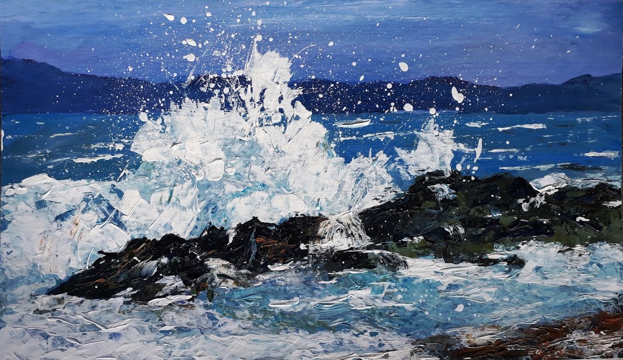 Description: An original acrylic painting of crashing waves on the Isle of Arran. The painting is framed. Size inc. frame 34 x 51 cm.