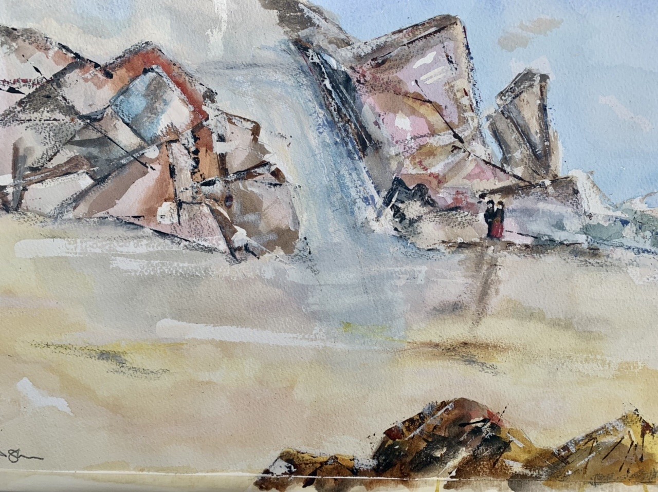 A fictional watercolour beach scene featuring a central waterfall cascading onto the sand. Signed by artist. Mounted and framed.