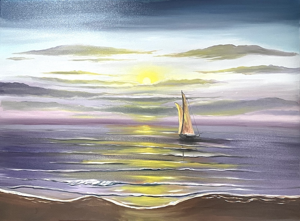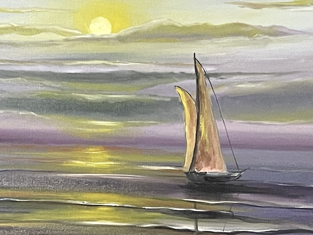 The sun peers through the lilac grey clouds, sending a cascade of its luminosity across the purple blue waters below, creating a kind of beautiful magic whilst a tranquil sail boat drifts across the sunset waters. This oil pinning has been varnished with gloss for protection, signed by the artist and wired at the back, ready for hanging onto the wall. This painting will be carefully packed into a custom made box and delivered within 2 working days by a tracked courier. Please allow a week for U.S deliveries. Also comes with a certificate of authenticity.