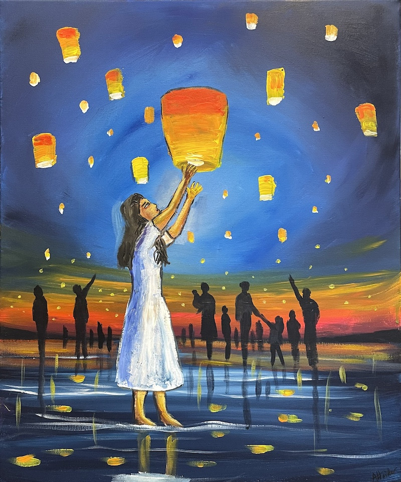 Lanterns are set off into the night sky in memory of loved ones that have departed and left memories. The magical warm lights fill the night sky casting their reflections upon the waters below and in the eyes of their owners full of hope and emotion. The painting has been varnished with gloss for protection. This painting carries on over the sides so it may be hung without a frame if desired. The painting has been signed by the artist and the canvas has been wired at the back for hanging onto the wall. This painting will be carefully packed into a custom made box and delivered within 2 working days by a tracked courier service. Also comes with a certificate of authenticity.