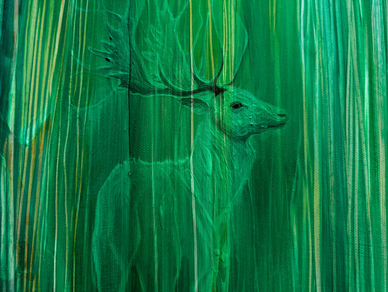 The Green Kings Glade is a green semi-abstract oil painting of a deer stag behind a green curtain that hints of a green forest glade. It is 36x30x1.5 inches. The deer stands in the centre whilst around him you see a sea of green and the hint if trees and branches. The deer is not always easy to see as the painting has texture and facets to it that can change with the light. At night it glows emerald green and in sunlight you see the stag and a clearing which gives it a magical fairy tale like feeling. The green king is a character who often appears in British folklore as does the symbol of a stag. Painted on deep edge canvas, white edges, no frame needed, ready to hang and comes with certificate of authenticity and gifts from the artist.