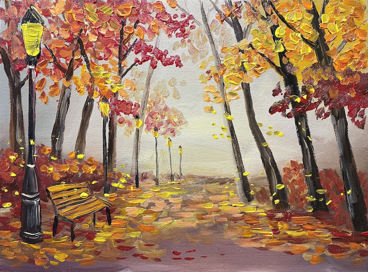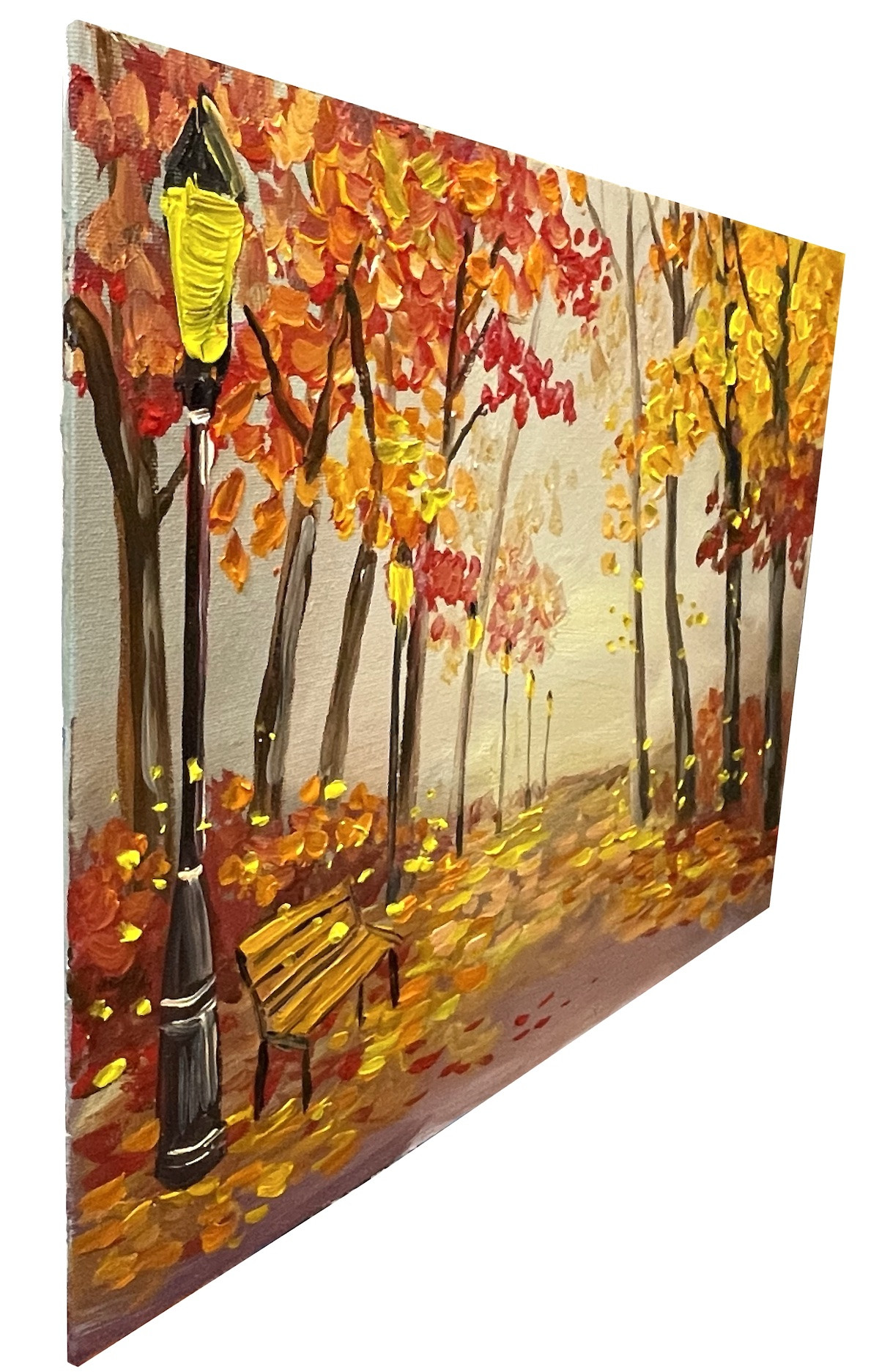 A textured painting of a peaceful autumn landscape on a canvas board varnished with gloss for protection. The painting will be carefully packed into a custom made box and delivered within 2 working days by a tracked courier service. Also comes with a certificate of authenticity.