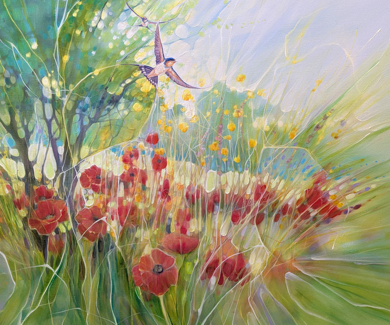 Keywords: Summer, poppies, swallows, tree, field, meadow, summer meadow, energetic, expressive, large oil painting for sale, art for sale, independent artists, Gill Bustamante paintings, Summer meadow, summer landscape, wildflowers, wildflower meadow, Sussex landscapes, semi-abstract landscape, atmospheric landscapes, semi abstract landscapes, magical, ethereal landscape paintings, bucolic, magical paintings, colourful, vibrant paintings, magical landscape paintings, large semi-abstract oil on canvas paintings, Sussex landscape paintings, Sussex artist, June in England, British landscape paintings, modern landscape painting, large oil paintings for sale, UK artist, contemporary British artists, beautiful colours, paintings of space and light, uplifting paintings, highly colourful, vibrant oil painting