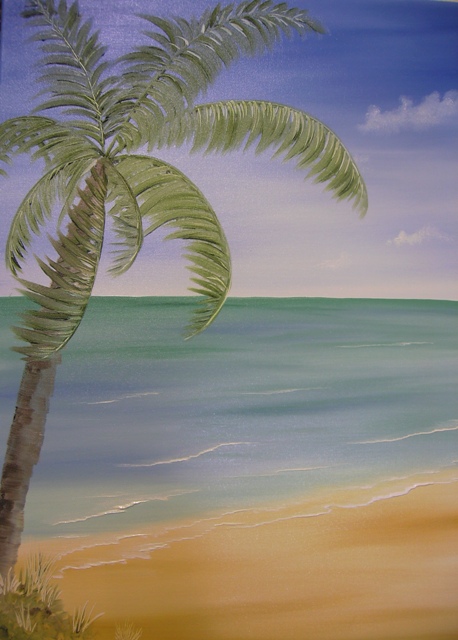 Keywords: Tropical, palm tree,paradise,summer day,blue,waves,beach,green,diane jennings,affordable british art,contemporary art,modern art,