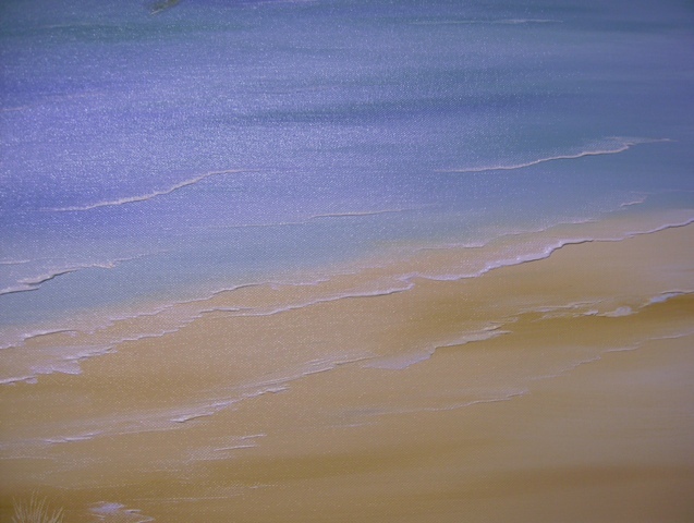 Painted in oil, the colours are fresh and vibrant. The waves lapping onto the beach are created using a palette knife which leaves the paint standing out from the canvas giving a very pleasing effect.