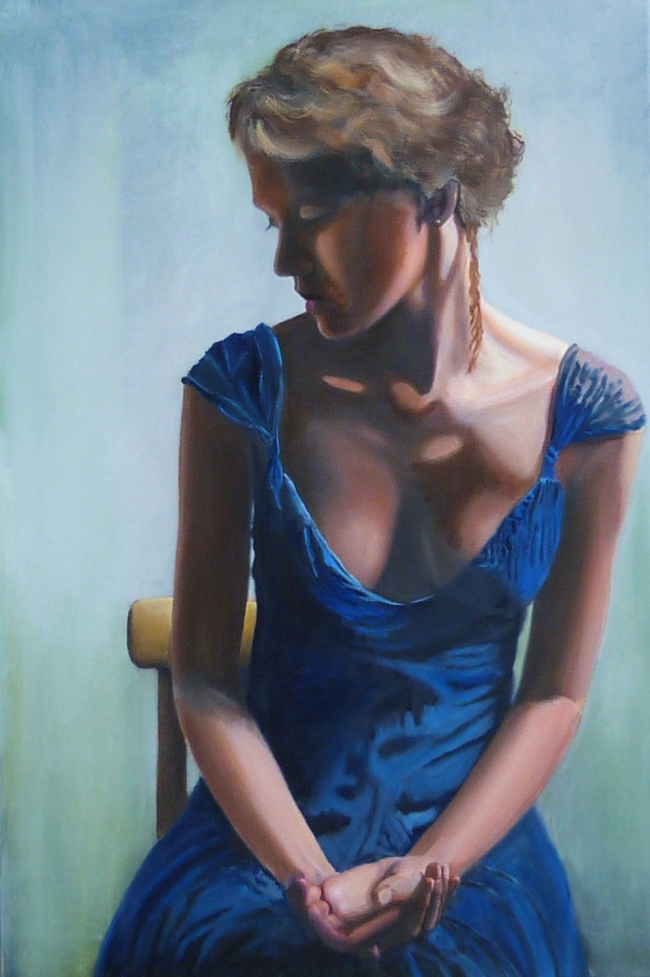 An attractive portrait of a beautiful young lady deep in thought. The work is set in a contemporary tray frame measuring 68 cm x 48 cm x 35mm overall, strung ready for hanging.