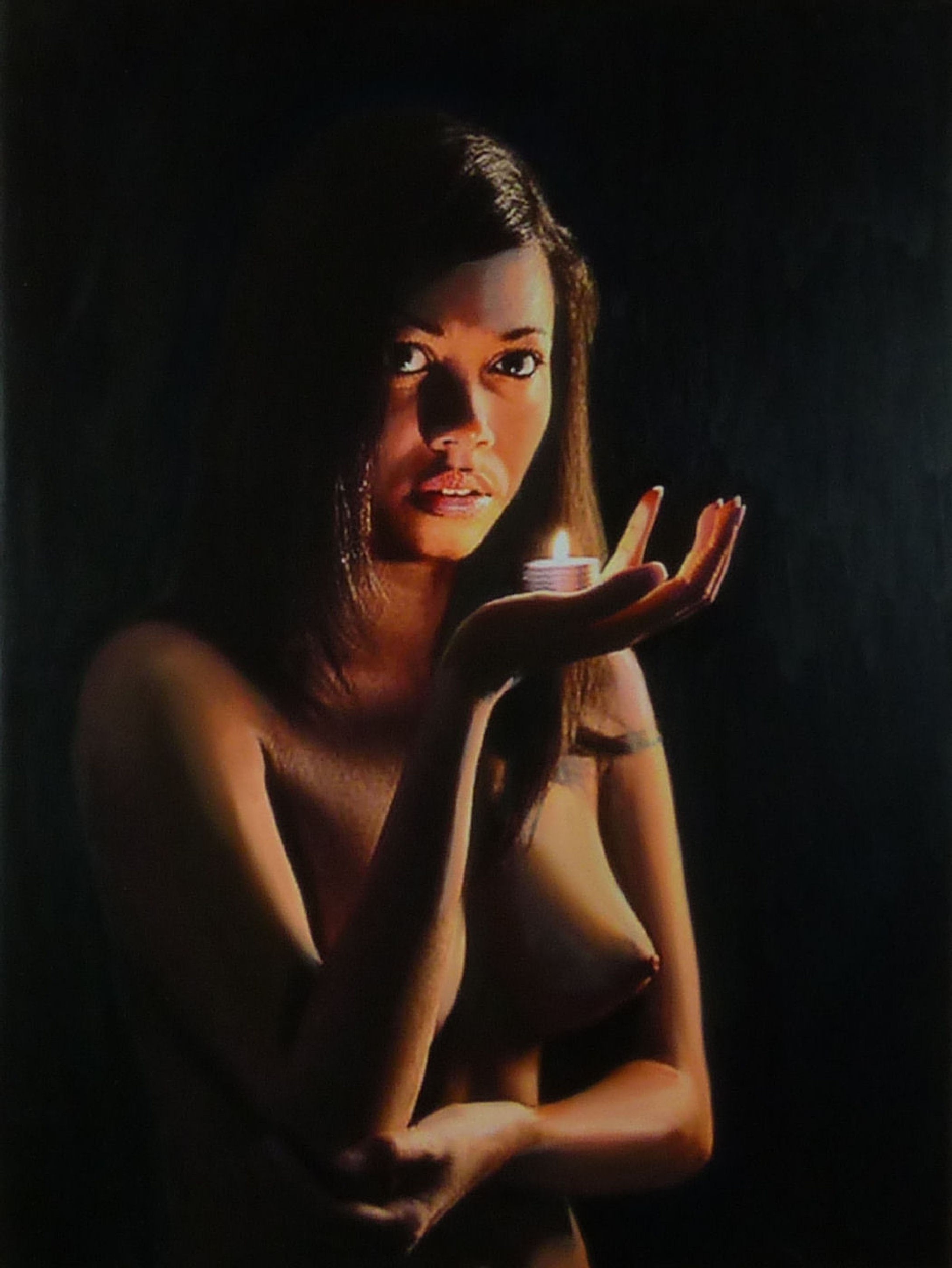 This is Claudine, a beautiful young lady of French Polynesian origin who, with her husband Armand, runs a marvellous little restaurant just off the chic (and very expensive) main street in the town of Aix-en-Provence in the south of France � former home of Paul Cezanne. Their very reasonably priced restaurant is one for the gourmet and serves meals in a wonderfully romantic atmosphere enhanced by the mellow lighting from the candles, hence the inspiration for this painting.