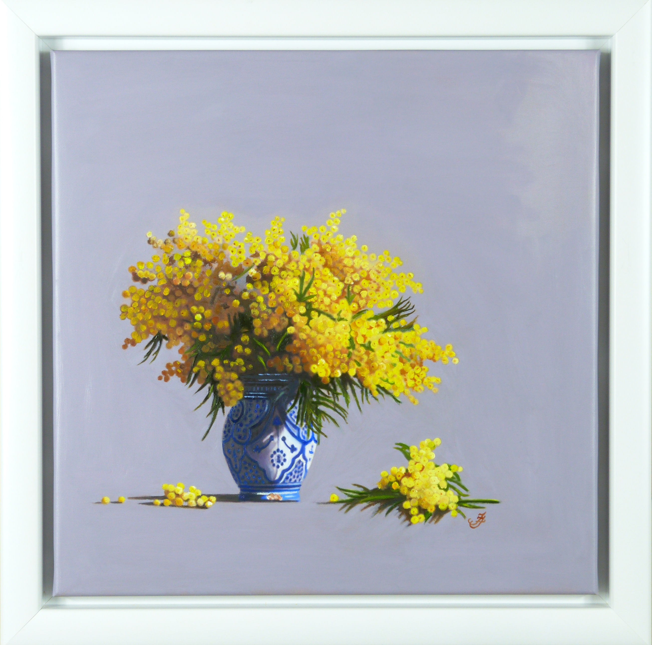 This is a colourful and realistic, highly detailed painting of sprigs of Mimosa in an old blue vase. It brings the warmth of the south of France into the home. It is painted on a standard depth stretched canvas and is set in a contemporary white tray frame measuring 48cm x 48 cm x 35 mm overall.