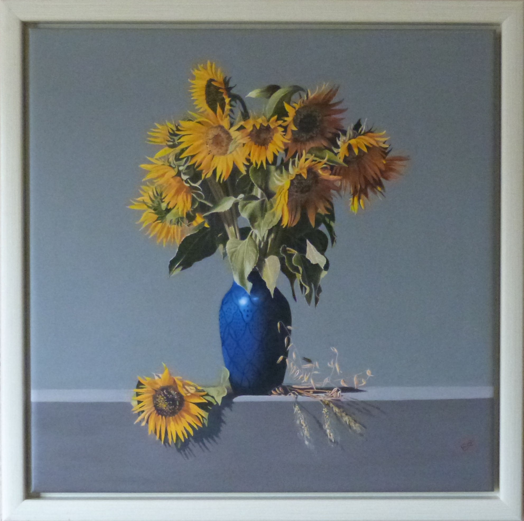 This is a very detailed and realistic painting of sunflowers - a taste of the warmth of the south of France in the home. Meticulously painted to make the viewer feel almost able to reach out and touch the petals and leaves. It is set in a light coloured contemporary tray frame measuring 68cm x 68cm x 35mm overall.