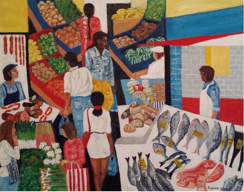 Iconic London Markets was inspired by “ Renato Guttuso,”La Vucciria” and her love to meander around markets that assault the senses. They celebrate diversity, colour and the chaotic yet ordered environment. Alterations of perspective are used to draw and engage the viewer into the space, the enormity of the building structures, the crowds and sumptuous produce.