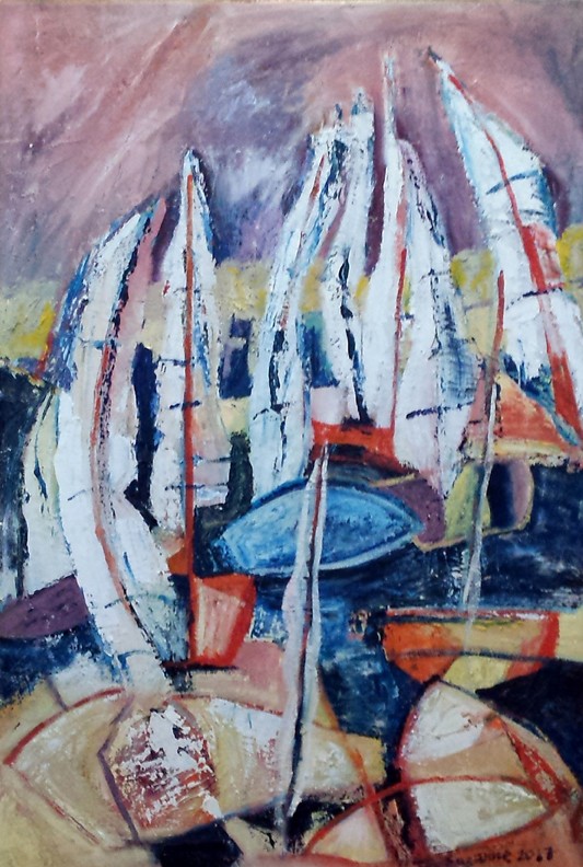 Revisited are a narrative inspired memories and family history, harbours and seascapes from Polperro where her grandfather was born to a family of boat builders to Devon where she was born. Retracing the coast she embraces her passion for the sea, trawlers and sailing boats. She explores how the subject and its colour and shape and outline change under the influence of light, time and movement of the tide.