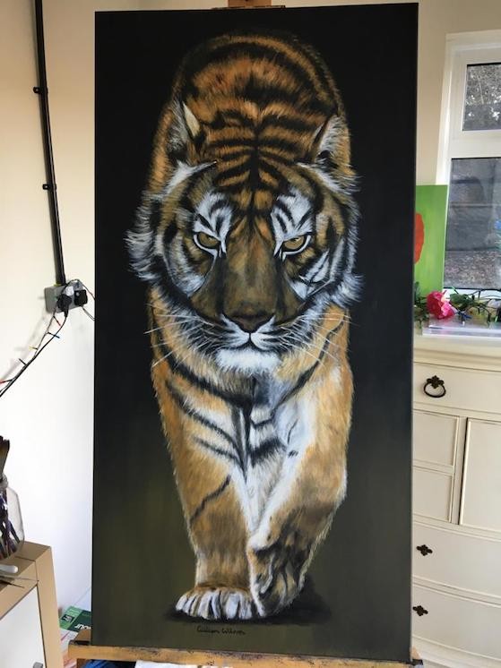 Such a pleasure to do this painting with the colours and the strong caracter of this tiger, It is the second painting I have done of tigers the first is the female which is also shown in my gallery, they could be sold as a pair. This is oil on boxed canvas and painted edges so no need to frame.