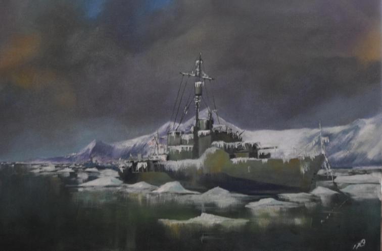 Description: Water soluble oil on canvas board. World War 2 Corvette shown anchored in Kola Peninsula area after outward bound convoy.