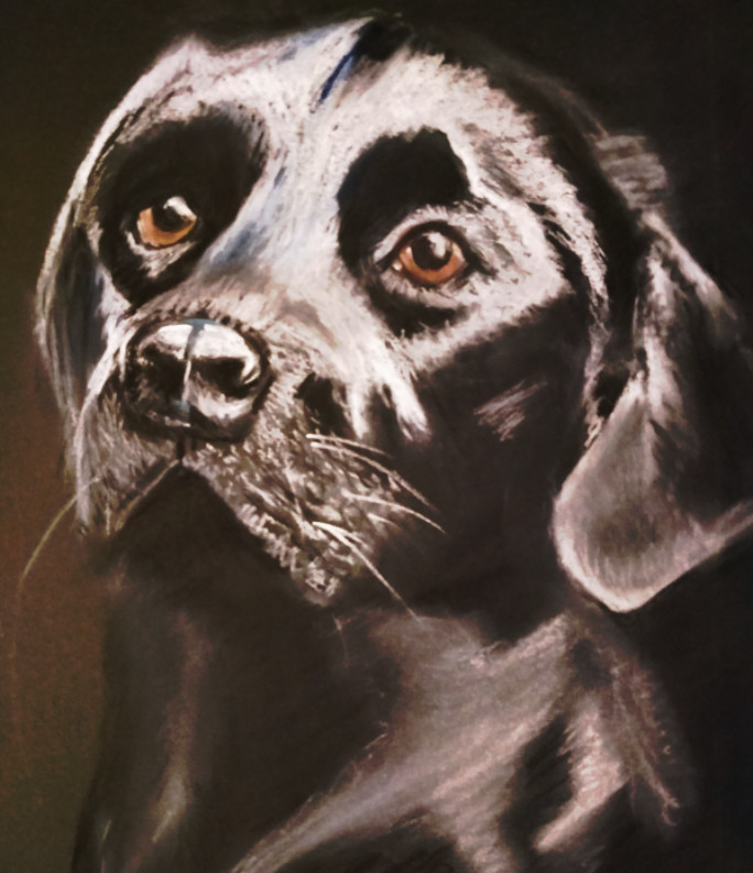 A black Labrador dog painted in pastel and pastel pencils. Commissions accepted of your pet, please contact me for more details.