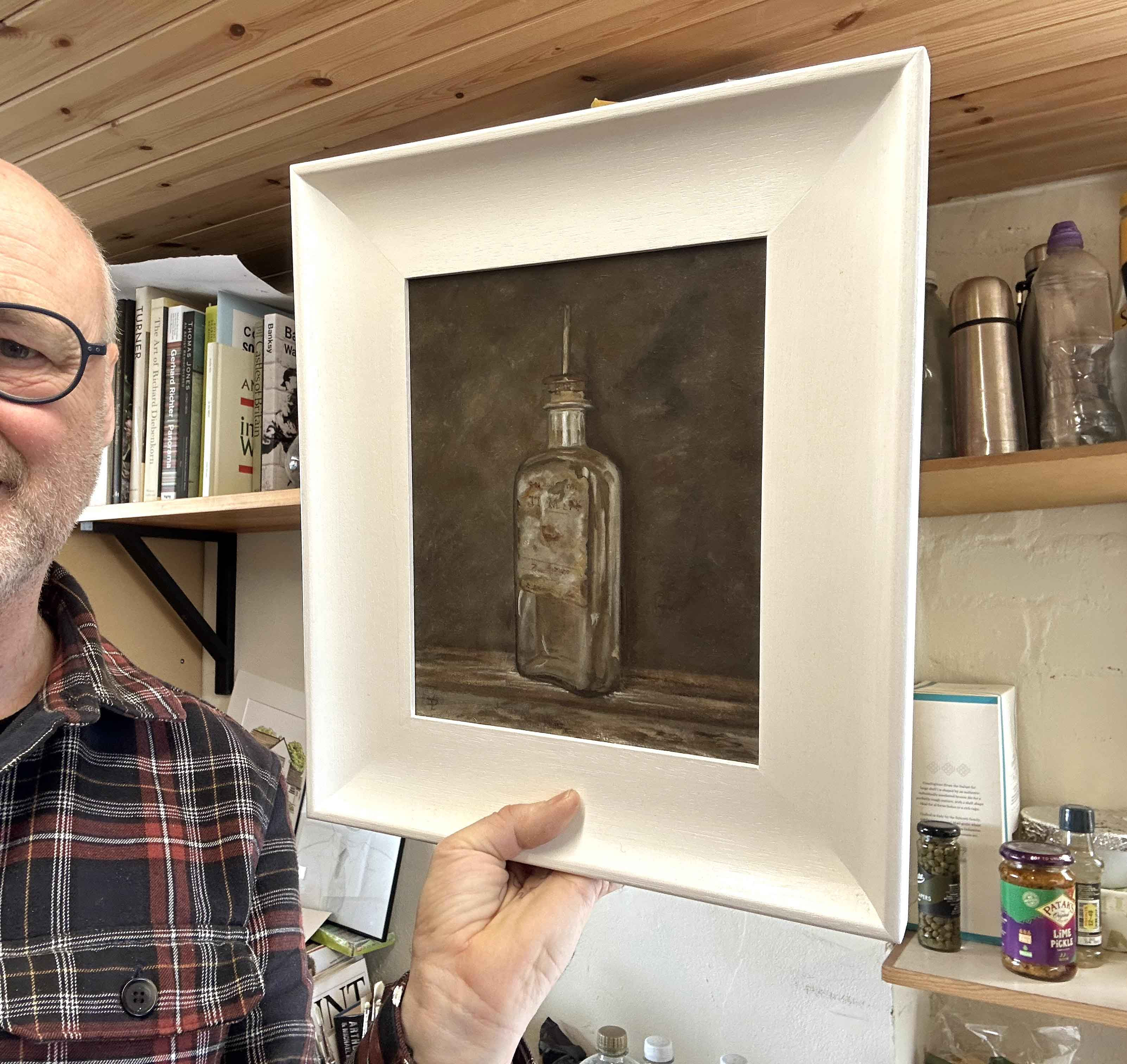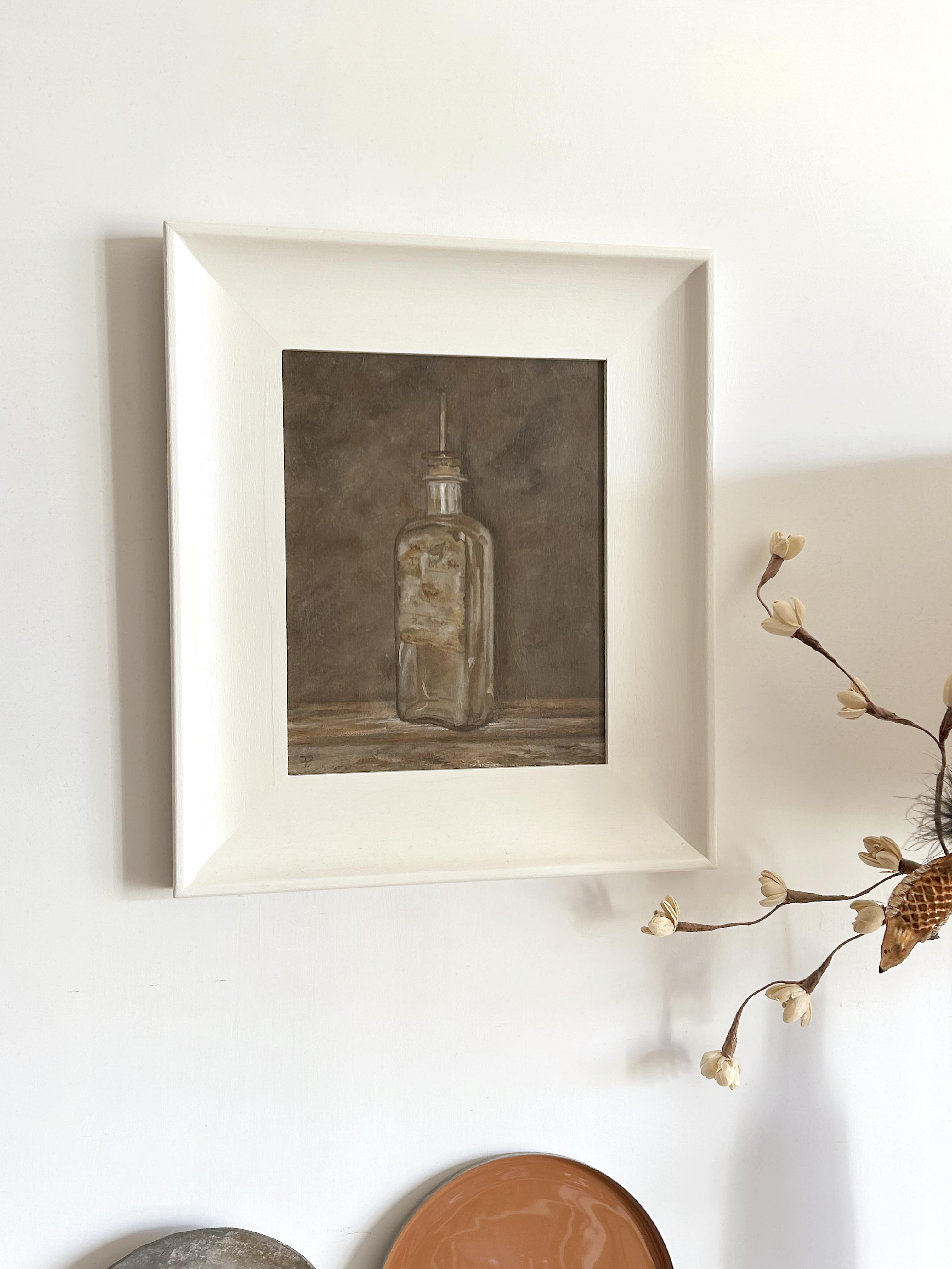 This is an old medicine bottle painted in oil on board. It is framed in a white handpainted wood frame.