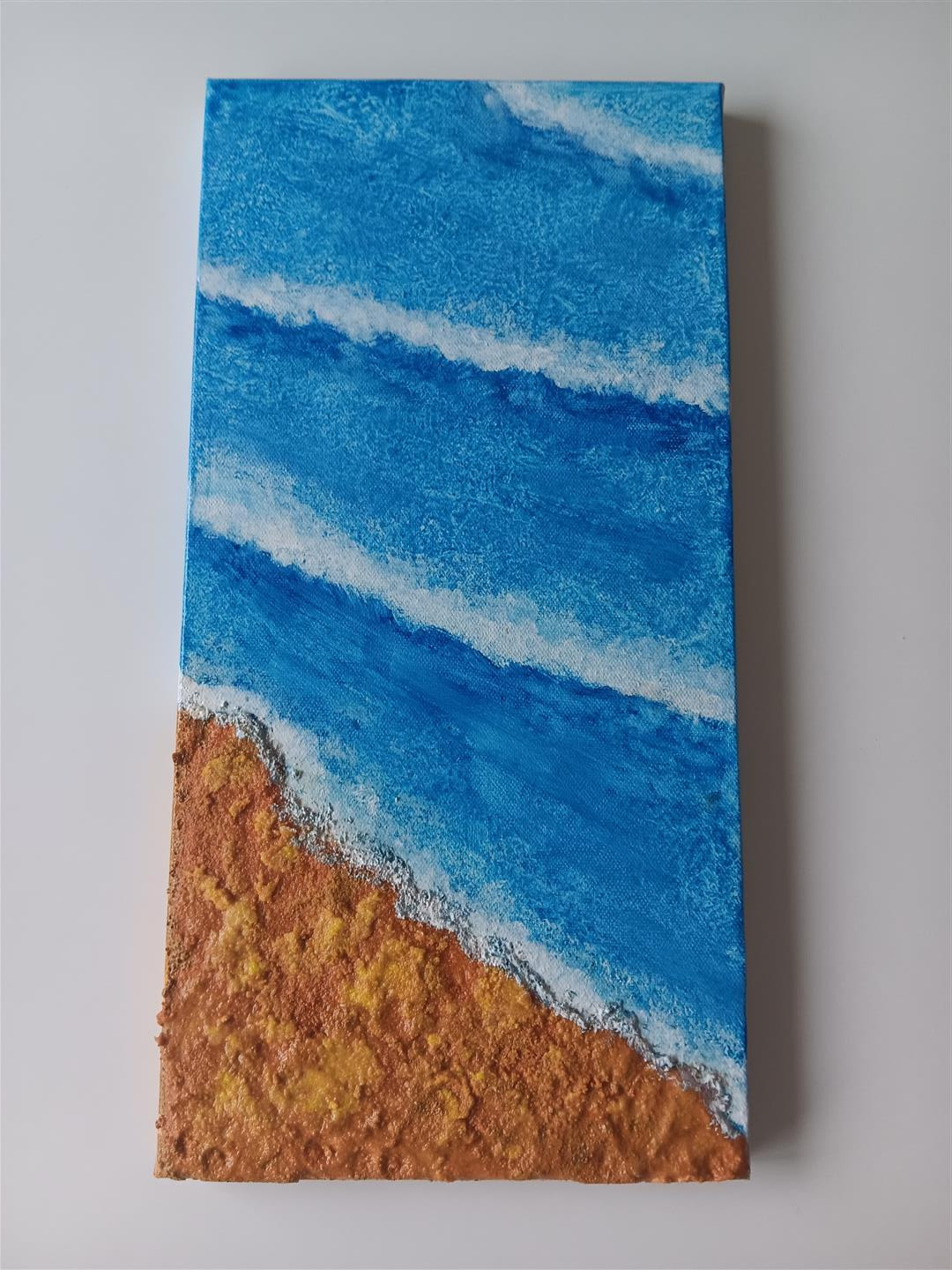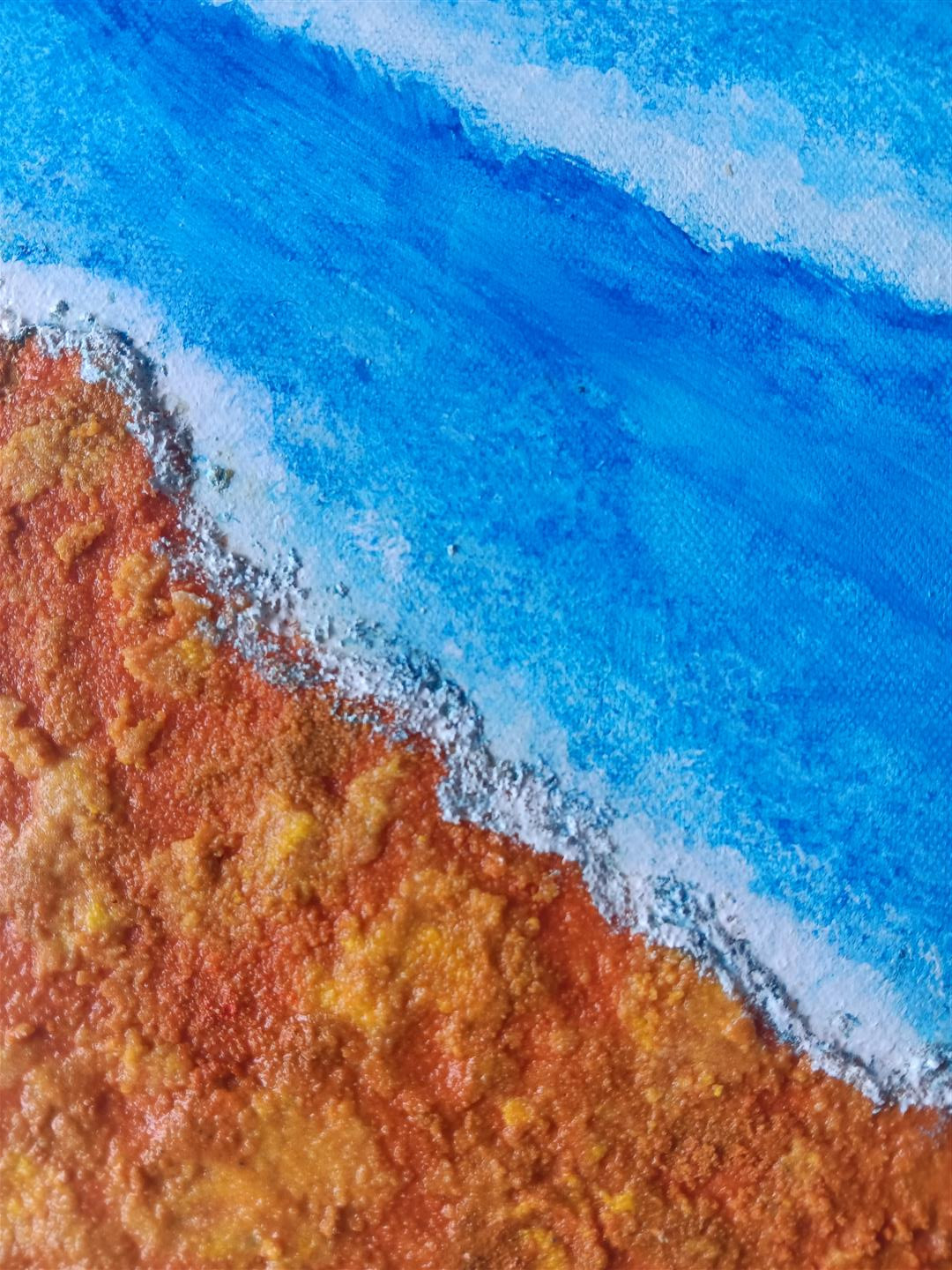 Coastal calm is a mix media painting. It is of the beach and sea from a birds eye view perspective. The sea is painted in watercolour and acrylic paint and the sand is created by mixing sugar with paint to create a 3D textured effect.