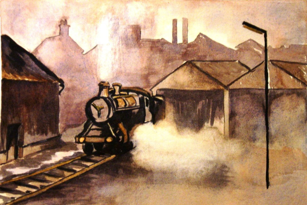 An old Great Western Railway Train in the sidings at the end of a smokey London day. An impressionist-style watercolour painted in 3 colours: raw sienna, cadmium red and french ultramarine. Signed and dated by the artist. This painting comes already framed in a 70mm high quality mount (charcoal inner 5mm and cream outer 65mm). The frame is dark oak with an inner gold trim. The total size framed is 540 x 440mm.