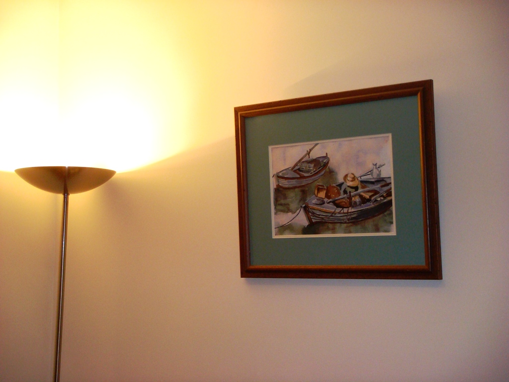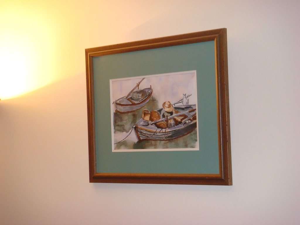 An impressionist-style watercolour based on a picture taken of a greek fisherman in a small harbour in Crete. Comes double mounted in a high quality aged oak glass frame ready for hanging. In frame measures 53 x 44 cm with double bevelled cream (5mm)and sea green (70mm) mount.