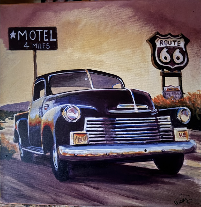Description: American car on route 66, painted on a 16” x16” deep canvas with painted sides.