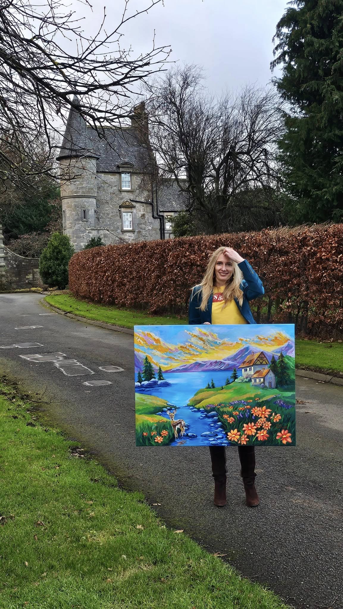 "The House of Dreams" is a vibrant acrylic landscape that captures this magical moment, featuring a cosy hillside cottage overlooking a tranquil blue stream. Buffed in the warm, golden flow of a setting sun, the scene is complete by dedicate fawn resting among a large field of bright orange wildflowers, perfectly preserving that feeling of peace and wonder.