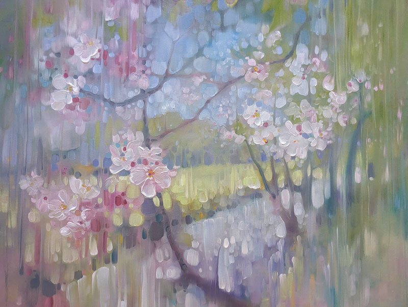 Keywords: Cherry blossom, apple blossom, Springtime, spring landscape, abstract spring, blossom trees, summer abstract, river, trees, seasons, pink blossom, blossom abstract, unique style, atmospheric landscapes, abstract landscapes, semi-abstract landscape, atmospheric landscapes, nature, waterscapes, contemporary British art, spiritual art, spiritual paintings, atmospheric abstraction, abstract nature