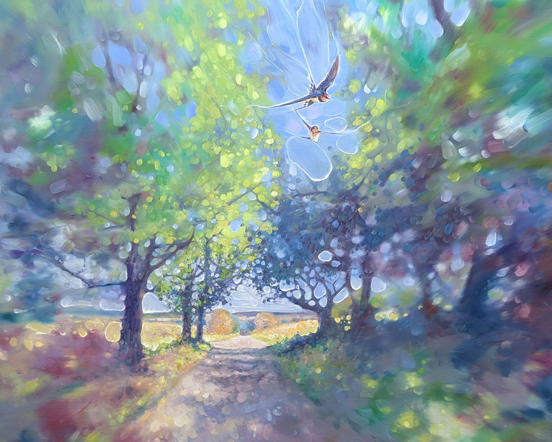 Keywords: Semi abstract landscape, swallows, abstract swallows, birds, Sussex landscape, Telescombe, river Ouse, Lewes, Seaford, South downs, countryside, otherworldly, ethereal, nature, trees, bucolic, English countryside, abstract vs realism, tranquil, art nouveau style, landscape painting, serene painting, ephemeral , ethereal landscapes, vibrant colours, landscapes, energetic, dynamic, Gill Bustamante artist, landscape inspiration, landscape painting about nature, landscape painting, semi-abstract landscape paintings for sale, paintings for sale, atmospheric landscapes, British landscape paintings, modern landscape painting, large oil paintings for sale, UK artist, contemporary British landscapes for sale, glowing paintings, beautiful colours, paintings of space and light, uplifting paintings, highly colourful, vibrant oil painting