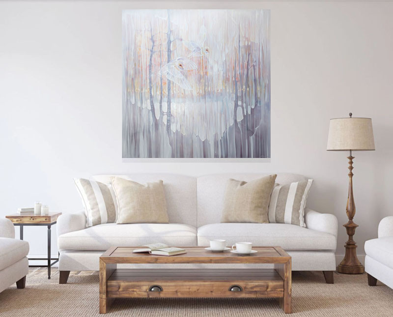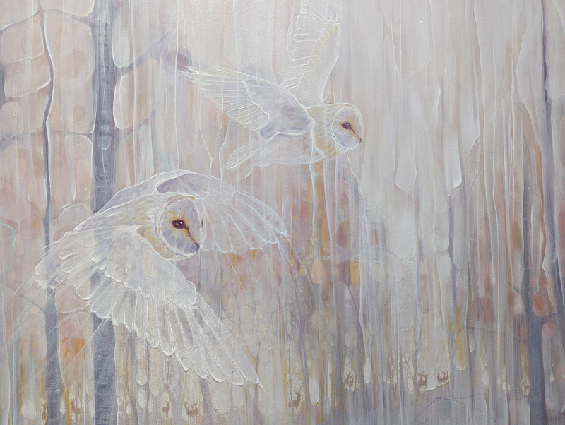 Out Of This World is a white, neutral toned, magical realism painting with barn owls and deer. It is 48x48x1.5 inches. The painting shows two transparent barn owls gliding through a woodland clearing with rows of deer observing them from beneath the trees. There is a hint of a lake and snow and the colour is predominately white with pale peach, gold, blues and lilacs. The inspiration was the feeling I get sometimes when entering a woodland and the atmosphere changes â as if nature holds her breath whilst I trespass though her domain. At the same time, I often spot deer staring at me and the birds stop singing which further enhances the idea that I have stumbled into another universe and am welcome only as long as I donât hang around too long⦠Painted on deep edge canvas, white edges, ready to hang and comes with certificate of authenticity.