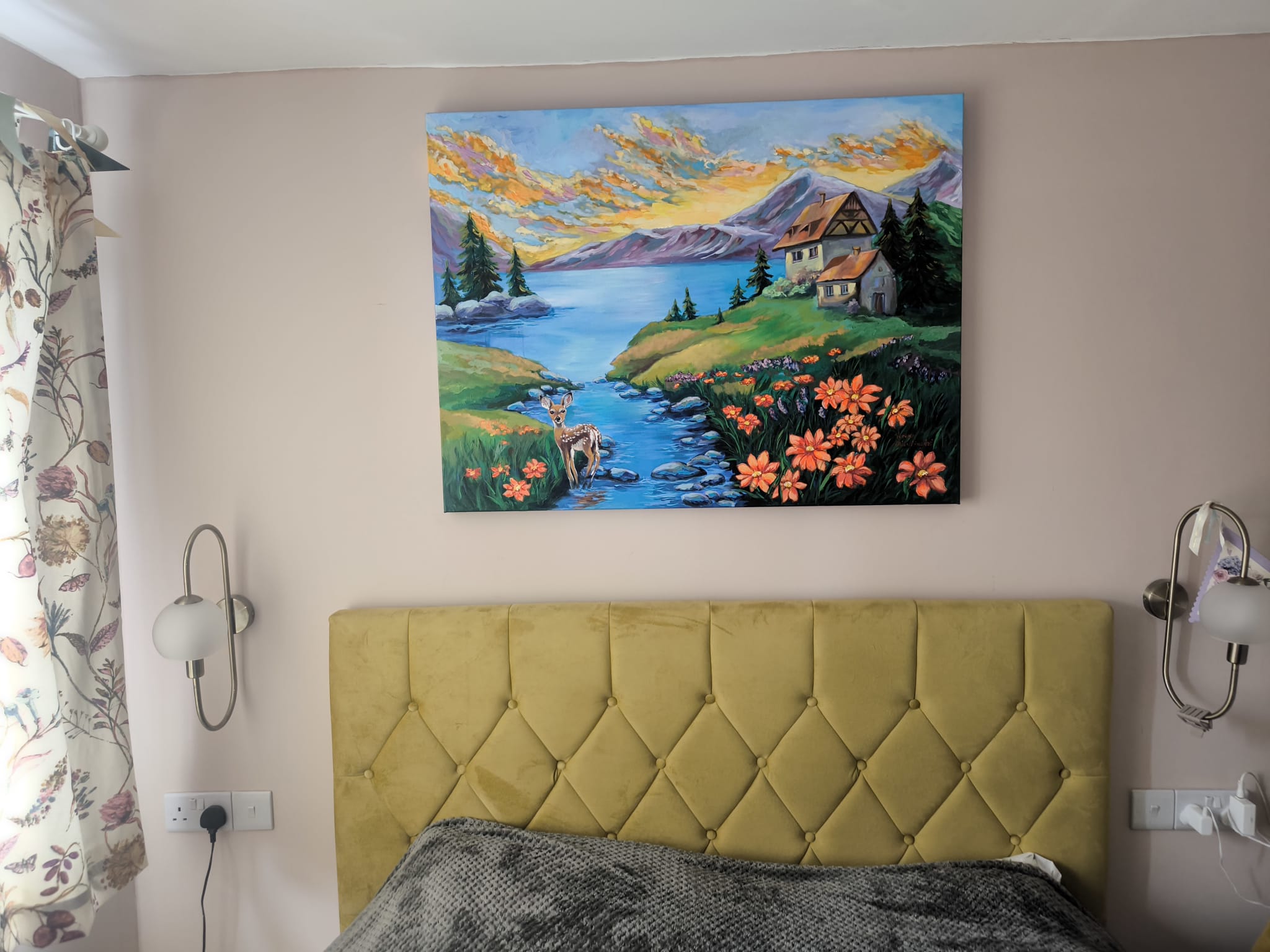 "The House of Dreams" is a vibrant acrylic landscape that captures this magical moment, featuring a cosy hillside cottage overlooking a tranquil blue stream. Buffed in the warm, golden flow of a setting sun, the scene is complete by dedicate fawn resting among a large field of bright orange wildflowers, perfectly preserving that feeling of peace and wonder.