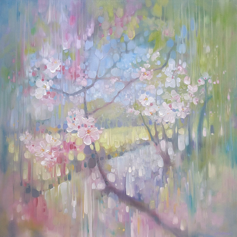 Keywords: Cherry blossom, apple blossom, Springtime, spring landscape, abstract spring, blossom trees, summer abstract, river, trees, seasons, pink blossom, blossom abstract, unique style, atmospheric landscapes, abstract landscapes, semi-abstract landscape, atmospheric landscapes, nature, waterscapes, contemporary British art, spiritual art, spiritual paintings, atmospheric abstraction, abstract nature