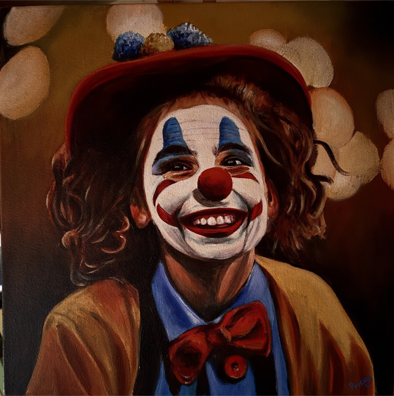 Girl dressed as a happy clown. Acrylic on a 20â x20â deep canvas with painted sides.